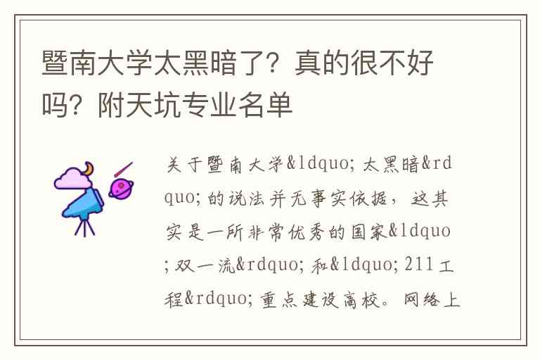 关于暨南大学“太黑暗”的说法并无事实依据,这其实是一所非常优秀的国家“双一流”和“211工程”重点建设高校。网络上的一些负面情绪,主要源于对学校某些管理措施或特定专业就业前景的个人感受,并不代表学校的整体面貌。