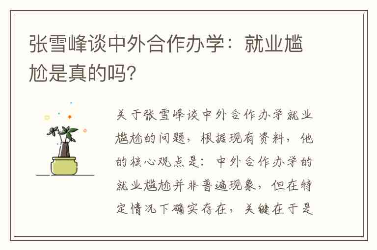 关于张雪峰谈中外合作办学就业尴尬的问题,根据现有资料,他的核心观点是:中外合作办学的就业尴尬并非普遍现象,但在特定情况下确实存在,关键在于是否选择了合适的项目以及学生的个人规划。
