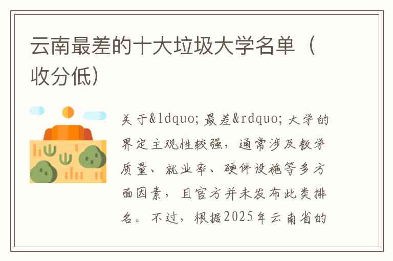 关于“最差”大学的界定主观性较强,通常涉及教学质量、就业率、硬件设施等多方面因素,且官方并未发布此类排名。不过,根据2025年云南省的录取数据,以下高校在历年招生中收分相对较低,适合分数优势不明显的考生作为参考。