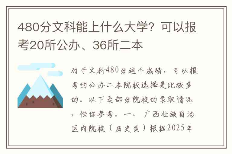 对于文科480分这个成绩,可以报考的公办二本院校选择是比较多的。以下是部分院校的录取情况,供你参考。