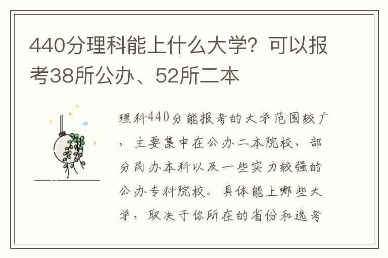 理科440分能报考的大学范围较广,主要集中在公办二本院校、部分民办本科以及一些实力较强的公办专科院校。具体能上哪些大学,取决于你所在的省份和选考科目。