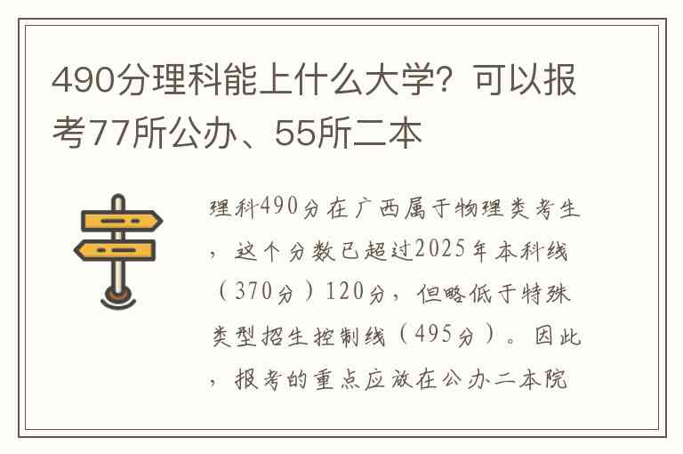 理科490分在广西属于物理类考生,这个分数已超过2025年本科线(370分)120分,但略低于特殊类型招生控制线(495分)。因此,报考的重点应放在公办二本院校上,并可以尝试一些在一本招生的冷门专业或中外合作办学项目。