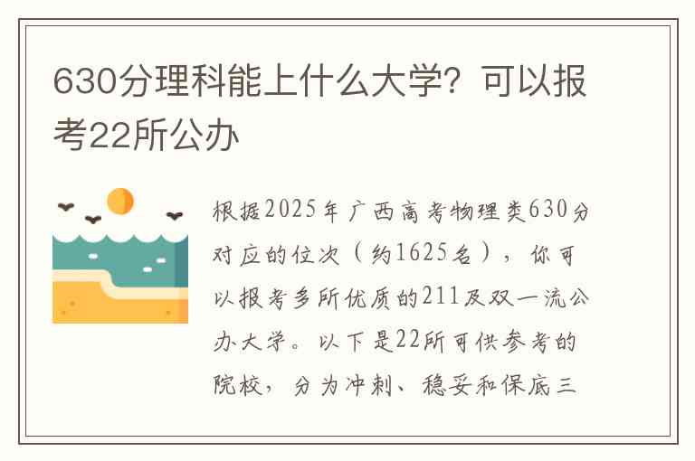 根据2025年广西高考物理类630分对应的位次(约1625名),你可以报考多所优质的211及双一流公办大学。以下是22所可供参考的院校,分为冲刺、稳妥和保底三个层次: