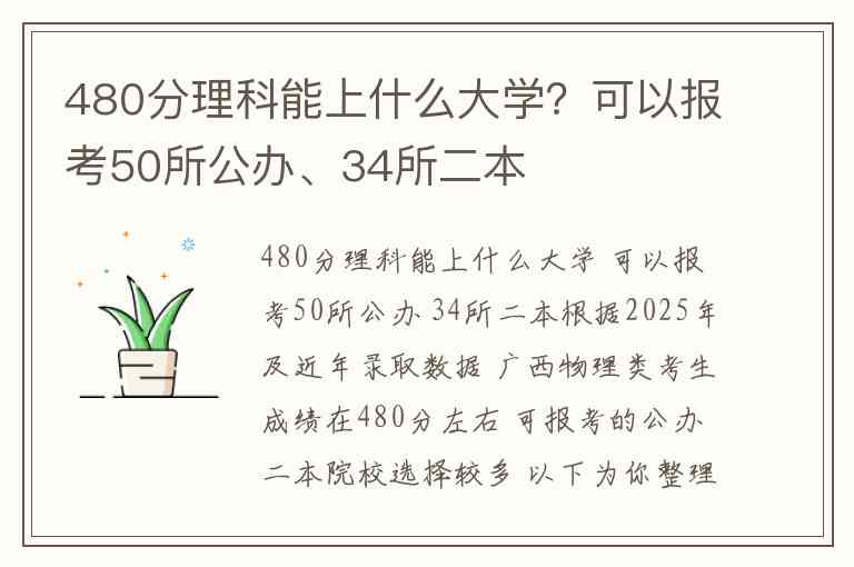 根据2025年及近年录取数据 广西物理类考生成绩在480分左右 可报考的公办二本院校选择较多 以下为你整理的相关院校名单及报考建议
