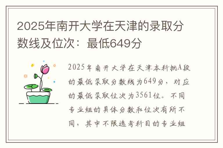 2025年南开大学在天津本科批A段的最低录取分数线为649分,对应的最低录取位次为3561位。
