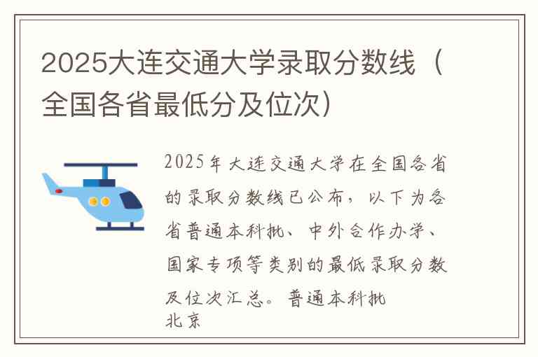 2025年大连交通大学在全国各省的录取分数线已公布,以下为各省普通本科批、中外合作办学、国家专项等类别的最低录取分数及位次汇总。