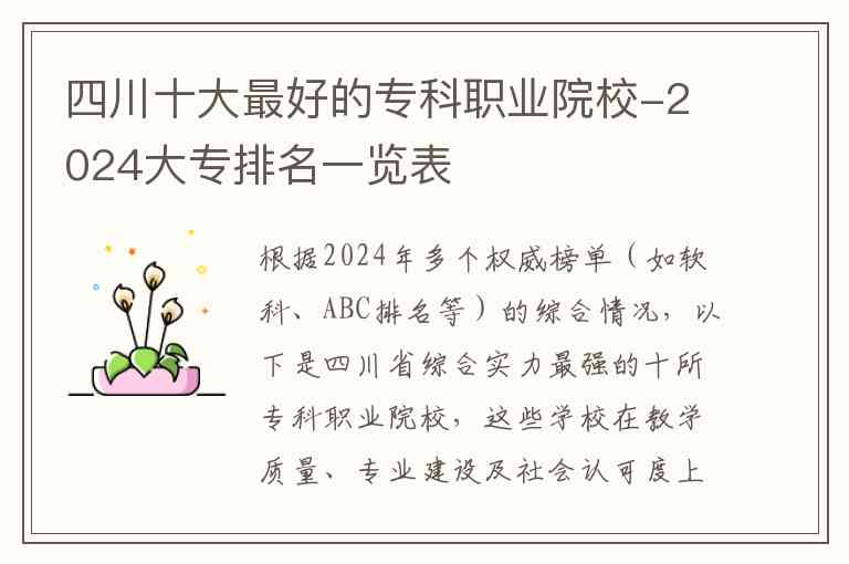 根据2024年多个权威榜单(如软科、ABC排名等)的综合情况,以下是四川省综合实力最强的十所专科职业院校,这些学校在教学质量、专业建设及社会认可度上均处于省内领先地位。