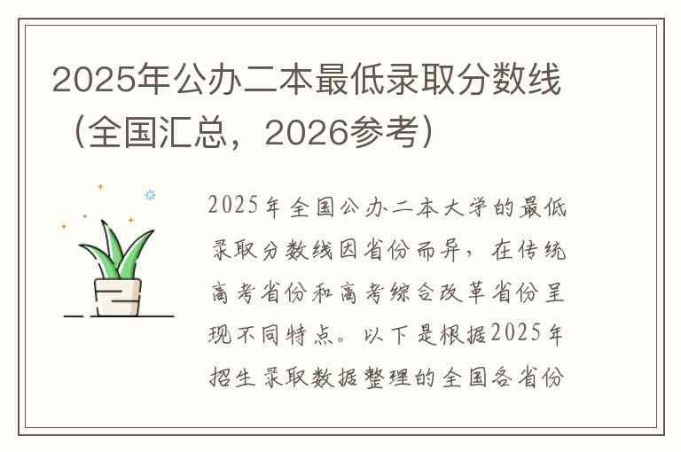 2025年全国公办二本大学的最低录取分数线因省份而异,在传统高考省份和高考综合改革省份呈现不同特点。以下是根据2025年招生录取数据整理的全国各省份公办二本大学的最低录取分数线汇总,供2026年考生参考。