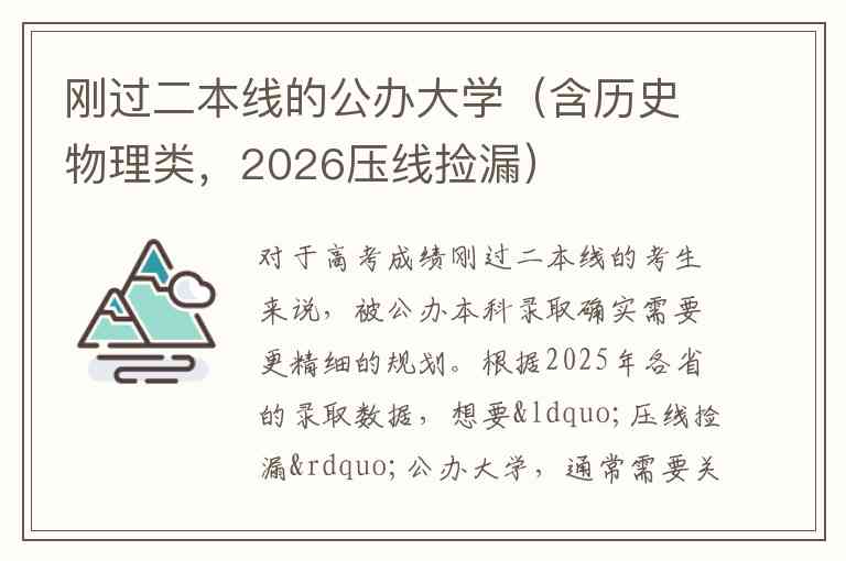 对于高考成绩刚过二本线的考生来说,被公办本科录取确实需要更精细的规划。根据2025年各省的录取数据,想要“压线捡漏”公办大学,通常需要关注地理位置相对偏远、中外合作办学或特定行业特色的院校。以下为你整理了2026年值得关注的公办大学名单及捡漏策略。
