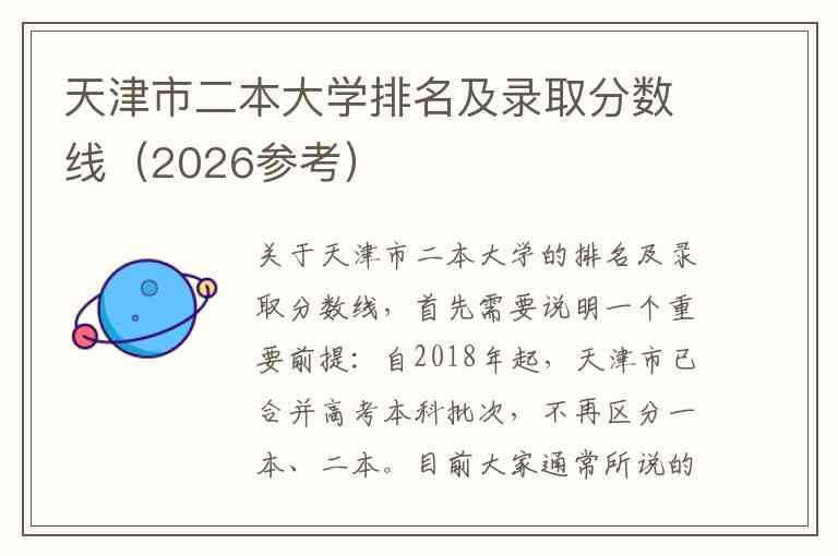 关于天津市二本大学的排名及录取分数线,首先需要说明一个重要前提:自2018年起,天津市已合并高考本科批次,不再区分一本、二本。目前大家通常所说的“二本大学”,一般指录取分数线在本科批次中段、综合实力较强的公办本科院校或部分优质民办院校。
