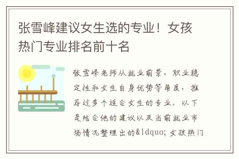 张雪峰老师从就业前景、职业稳定性和女生自身优势等角度,推荐过多个适合女生的专业。以下是结合他的建议以及当前就业市场情况整理出的“女孩热门专业排名前十名”:
