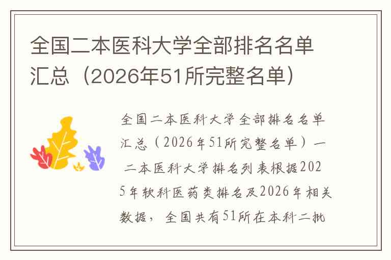 全国二本医科大学全部排名名单汇总(2026年51所完整名单)