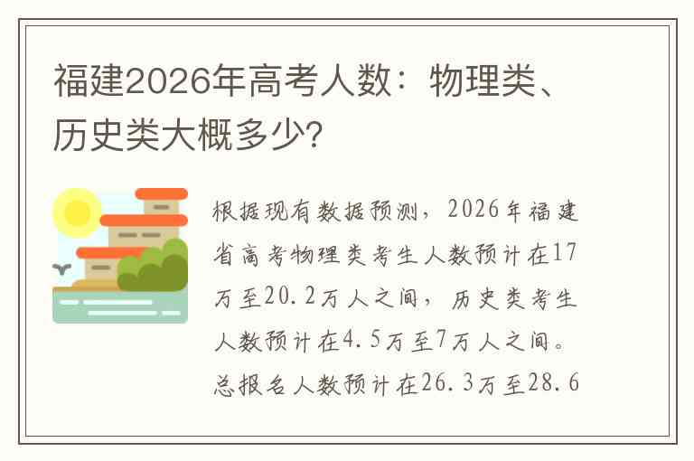 根据现有数据预测,2026年福建省高考物理类考生人数预计在17万至20.2万人之间,历史类考生人数预计在4.5万至7万人之间。总报名人数预计在26.3万至28.65万人之间,但上述分科数据均为预测值,最终人数需以福建省教育考试院官方公布为准。