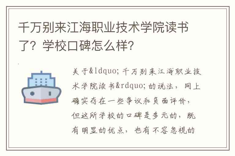 关于“千万别来江海职业技术学院读书”的说法,网上确实存在一些争议和负面评价,但这所学校的口碑是多元的,既有明显的优点,也有不容忽视的问题。综合来看,可以总结为以下几个方面。