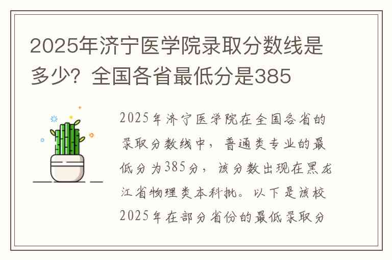 2025年济宁医学院在全国各省的录取分数线中,普通类专业的最低分为385分,该分数出现在黑龙江省物理类本科批。