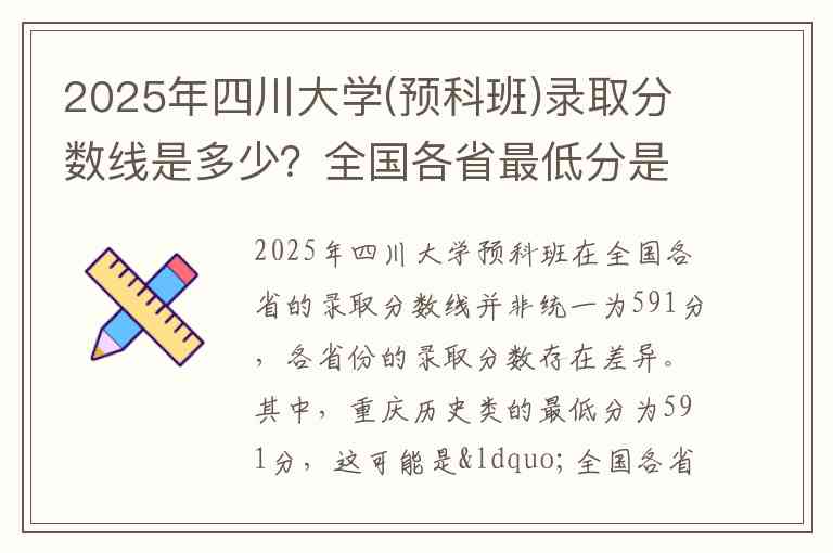 2025年四川大学预科班在全国各省的录取分数线并非统一为591分,各省份的录取分数存在差异。其中,重庆历史类的最低分为591分,这可能是“全国各省最低分是591分”这一说法的来源。其他省份的录取分数线如下: