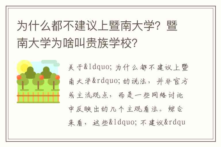 关于“为什么都不建议上暨南大学”的说法,并非官方或主流观点,而是一些网络讨论中反映出的几个主观看法。综合来看,这些“不建议”的理由主要集中在以下几个方面: