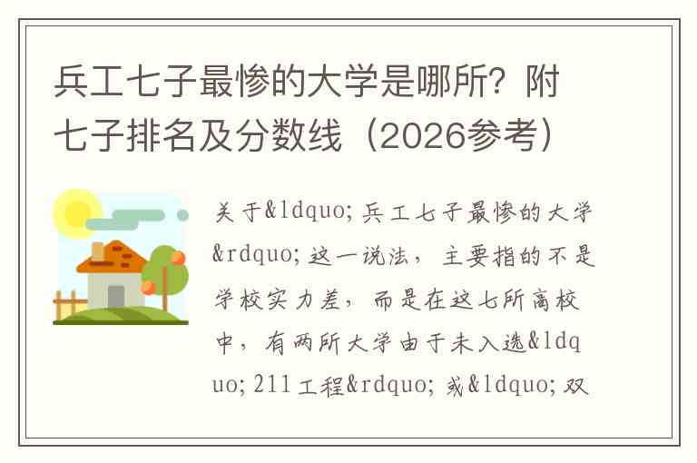 关于“兵工七子最惨的大学”这一说法,主要指的不是学校实力差,而是在这七所高校中,有两所大学由于未入选“211工程”或“双一流”建设名单、地理位置不占优势、以及受行业调整影响较大,在综合排名和社会知名度上相对处于弱势,常被考生和家长称为“最惨”或性价比最高的选择。这两所大学分别是中北大学和沈阳理工大学。
