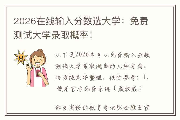 以下是2026年可以免费输入分数测试大学录取概率的几种方式,均为纯文字整理,供你参考:
