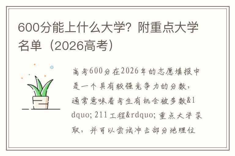 高考600分在2026年的志愿填报中是一个具有较强竞争力的分数,通常意味着考生有机会被多数“211工程”重点大学录取,并可以尝试冲击部分地理位置相对偏远或学科特色明显的“985工程”大学。