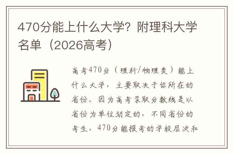 高考470分(理科/物理类)能上什么大学,主要取决于你所在的省份。因为高考录取分数线是以省份为单位划定的,不同省份的考生,470分能报考的学校层次和名单差异很大。
