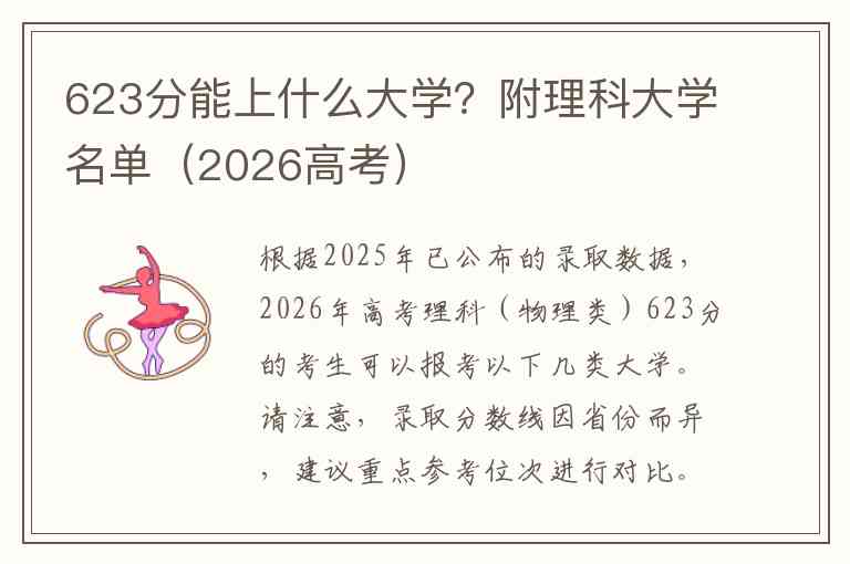 根据2025年已公布的录取数据,2026年高考理科(物理类)623分的考生可以报考以下几类大学。请注意,录取分数线因省份而异,建议重点参考位次进行对比。