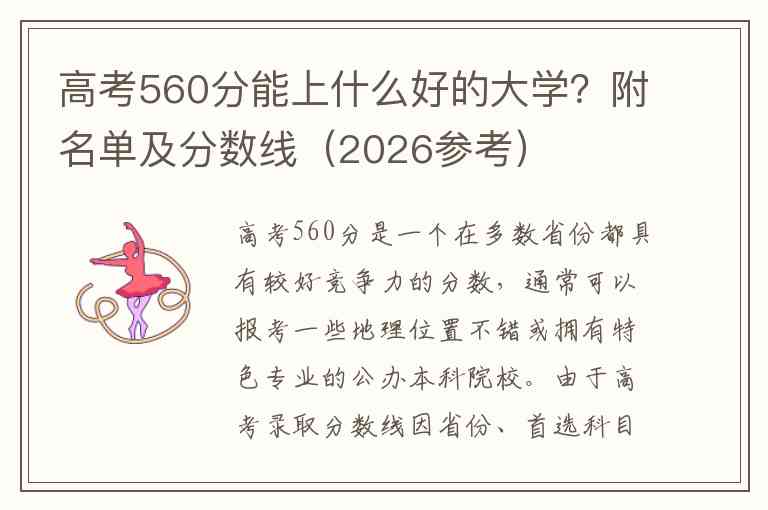 高考560分是一个在多数省份都具有较好竞争力的分数,通常可以报考一些地理位置不错或拥有特色专业的公办本科院校。由于高考录取分数线因省份、首选科目(物理/历史)及年份而异,以下基于2025年部分省份的录取数据,整理了一份560分左右能报考的大学参考名单,供2026年考生和家长查阅。