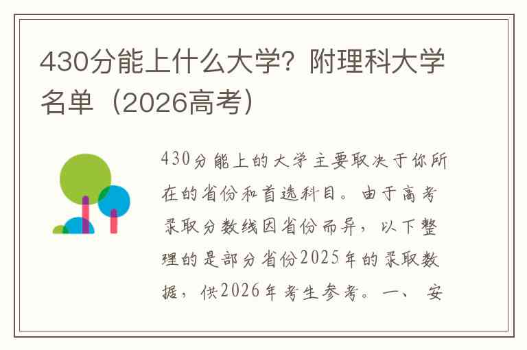 430分能上的大学主要取决于你所在的省份和首选科目。由于高考录取分数线因省份而异,以下整理的是部分省份2025年的录取数据,供2026年考生参考。