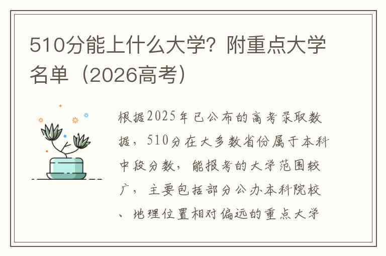 根据2025年已公布的高考录取数据,510分在大多数省份属于本科中段分数,能报考的大学范围较广,主要包括部分公办本科院校、地理位置相对偏远的重点大学以及一些优质的民办本科院校。由于高考录取分数线因省份和选科组合而异,以下整理的部分院校名单及位次信息可供你参考。