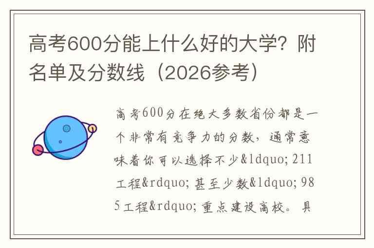 高考600分在绝大多数省份都是一个非常有竞争力的分数,通常意味着你可以选择不少“211工程”甚至少数“985工程”重点建设高校。具体的录取结果会因省份、首选科目(物理/历史)以及当年的招生计划而有所不同。