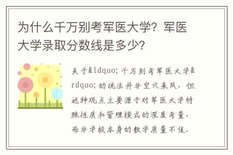 关于“千万别考军医大学”的说法并非空穴来风,但这种观点主要源于对军医大学特殊性质和管理模式的深度考量,而非学校本身的教学质量不佳。实际上,军医大学拥有顶尖的医学资源和极高的社会声誉,但选择它确实意味着选择了一条与普通医科大学截然不同的道路。