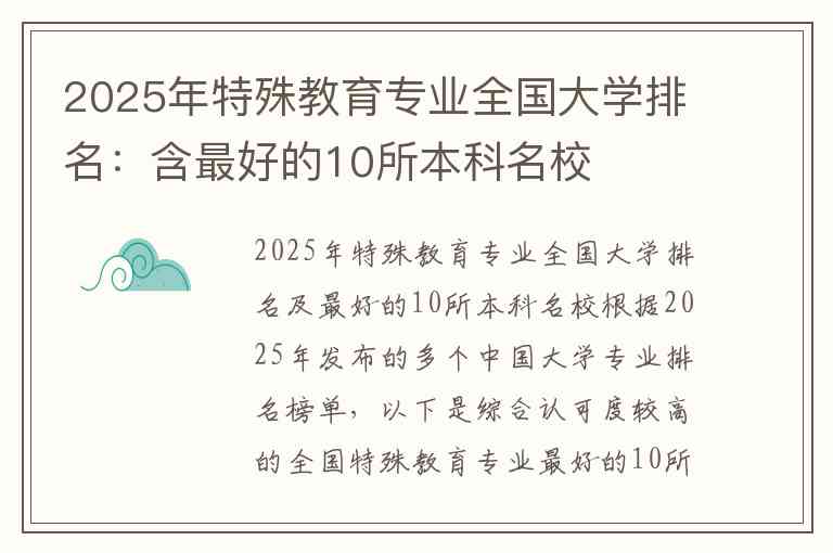 根据2025年发布的多个中国大学专业排名榜单,以下是综合认可度较高的全国特殊教育专业最好的10所本科院校,这些院校在师资力量、科研水平、专业建设和行业影响力等方面均处于国内领先地位。