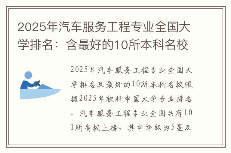 根据2025年软科中国大学专业排名,汽车服务工程专业全国共有101所高校上榜,其中评级为5星及以上的高校共10所,具体排名如下: