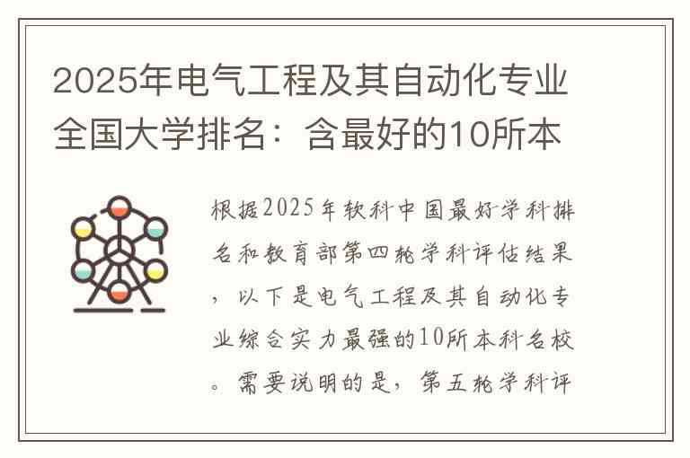根据2025年软科中国最好学科排名和教育部第四轮学科评估结果,以下是电气工程及其自动化专业综合实力最强的10所本科名校。需要说明的是,第五轮学科评估结果目前尚未对社会完全公布,因此第四轮评估结果仍是目前最权威的参考依据。