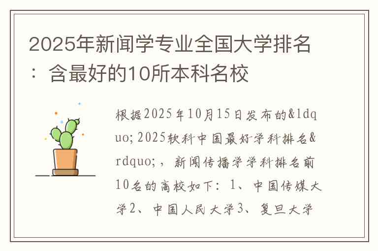 根据2025年10月15日发布的“2025软科中国最好学科排名”,新闻传播学学科排名前10名的高校如下: