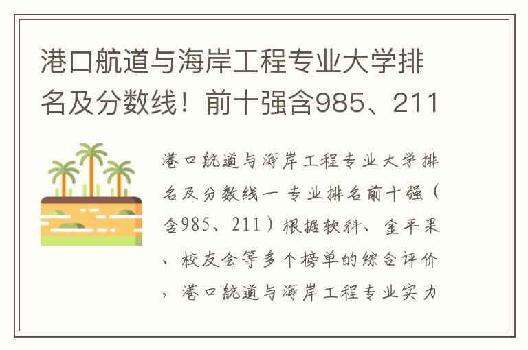 根据软科、金平果、校友会等多个榜单的综合评价,港口航道与海岸工程专业实力最强的十所高校如下: