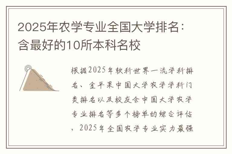 根据2025年软科世界一流学科排名、金平果中国大学农学学科门类排名以及校友会中国大学农学专业排名等多个榜单的综合评估,2025年全国农学专业实力最强的十所本科名校如下: