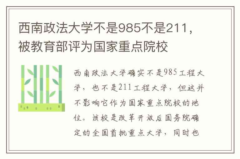 西南政法大学确实不是985工程大学,也不是211工程大学,但这并不影响它作为国家重点院校的地位。该校是改革开放后国务院确定的全国首批重点大学,同时也是教育部与重庆市人民政府共建高校。