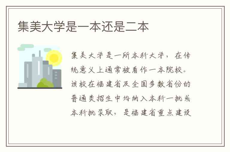集美大学是一所本科大学,在传统意义上通常被看作一本院校。该校在福建省及全国多数省份的普通类招生中均纳入本科一批或本科批录取,是福建省重点建设的高校