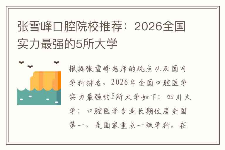 根据张雪峰老师的观点以及国内学科排名,2026年全国口腔医学实力最强的5所大学如下: