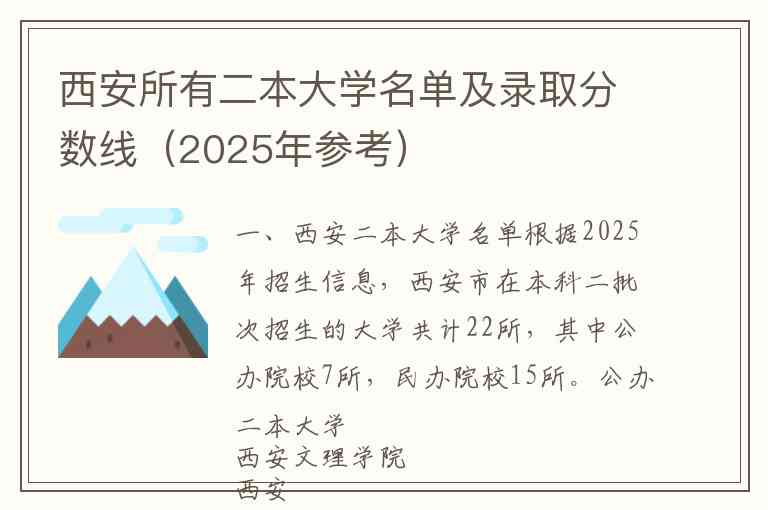 根据2025年招生信息,西安市在本科二批次招生的大学共计22所,其中公办院校7所,民办院校15所。