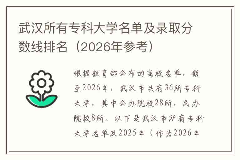 根据教育部公布的高校名单,截至2026年,武汉市共有36所专科大学,其中公办院校28所,民办院校8所。