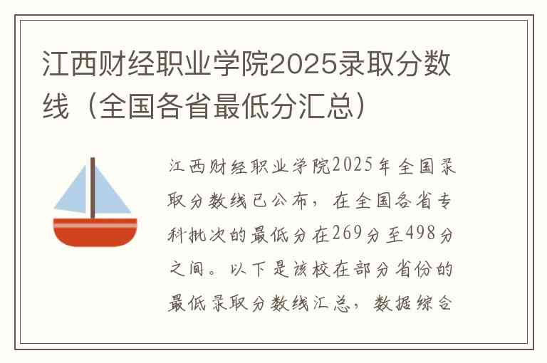 江西财经职业学院2025年全国录取分数线已公布,在全国各省专科批次的最低分在269分至498分之间。以下是该校在部分省份的最低录取分数线汇总,数据综合自各省教育考试院及学校招生信息。