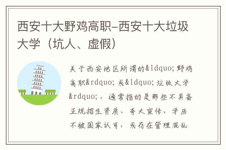 关于西安地区所谓的“野鸡高职”或“垃圾大学”,通常指的是那些不具备正规招生资质、夸大宣传、学历不被国家认可,或存在管理混乱、虚假承诺等问题的院校。